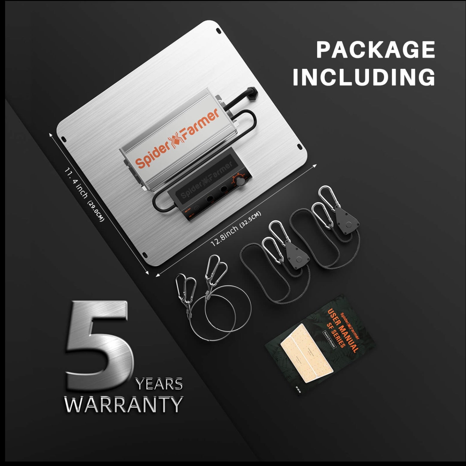 • WELL MADE & SOLID CONSTRUCTION: No Fan Noise Free. High Efficient, reliable and SPIDER FARMER Brand Driver have great dissipate heat. Aluminum heat sink is thick and sturdy, protective covers for cables; User-Friendly Packaging. Quality components mean the light lasts longer, SF Light takes good cares of you with more considerate design, you can easily save money without purchasing lights frequently.