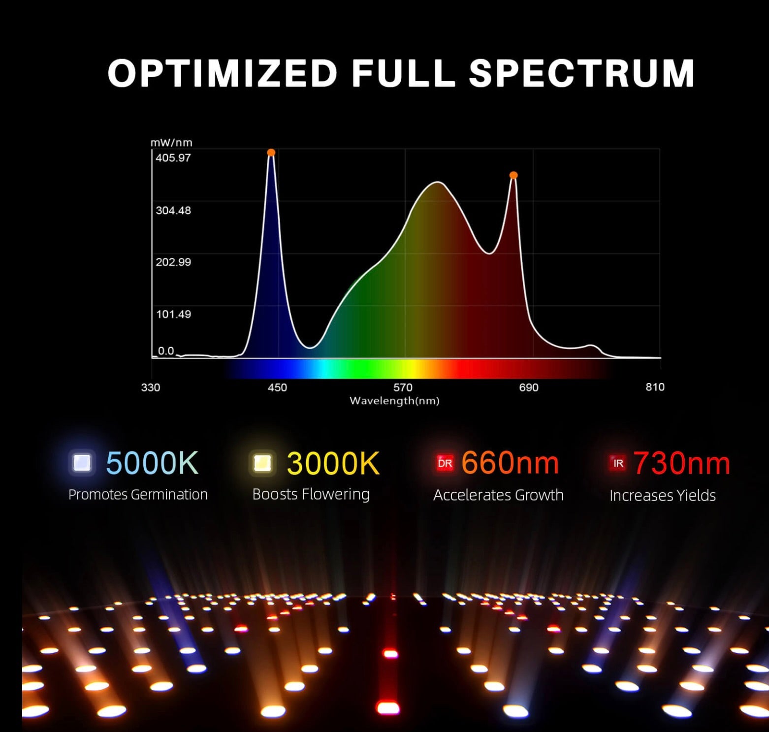• IDEAL FOR ALL GROWTH STAGES: Excellent full spectrum- white, blue, red and IR (3000K, 5000K, 660nm and IR 760nm, IR is dimmer than other red diodes.You can wear glasses to see it ). 3000K providing more reddish light and the 5000K providing more blueish. The 660nm red and IR light is especially useful during bloom, where it speeds up flowering time and boost yields. Uniformly across the surface and deep into the roots and bottom of canopy for consistent, highest quality flowers.