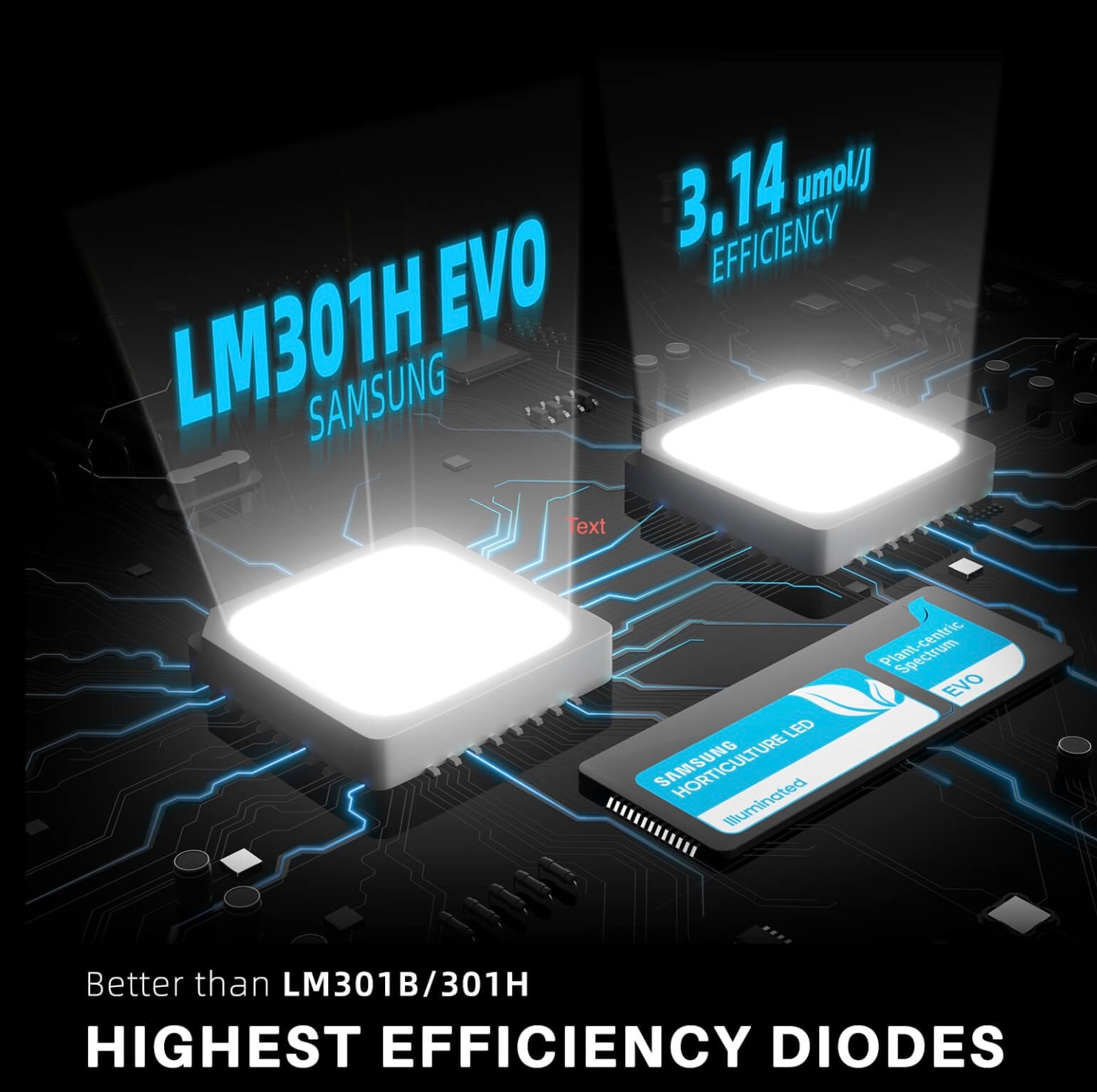 • Cutting-Edge LED Chips for Unrivaled Performance:Introducing the Samsung LM301H EVO LEDs. Boasting an impressive efficiency rating of 3.14 µmol/J PPE per diode , these LEDs outshine even the renowned LM301B, LM301H, and Bridgelux 3030 chips in terms of sheer effectiveness. Representing the pinnacle of horticulture lighting technology, they radiate unparalleled brilliance while operating at heightened efficiency levels. Surpassing the capabilities of both the Samsung LM301H and LM301B LEDs, these EVO LEDs redefine plant growth enhancement. With superior light quality and an increased light output per LED, they harness a more potent blue spectrum, all while achieving a level of efficiency unattainable by non-EVO LEDs. Veg footprint is 3 x 3 ft, Flowering footprint is 2 x 2 ft.