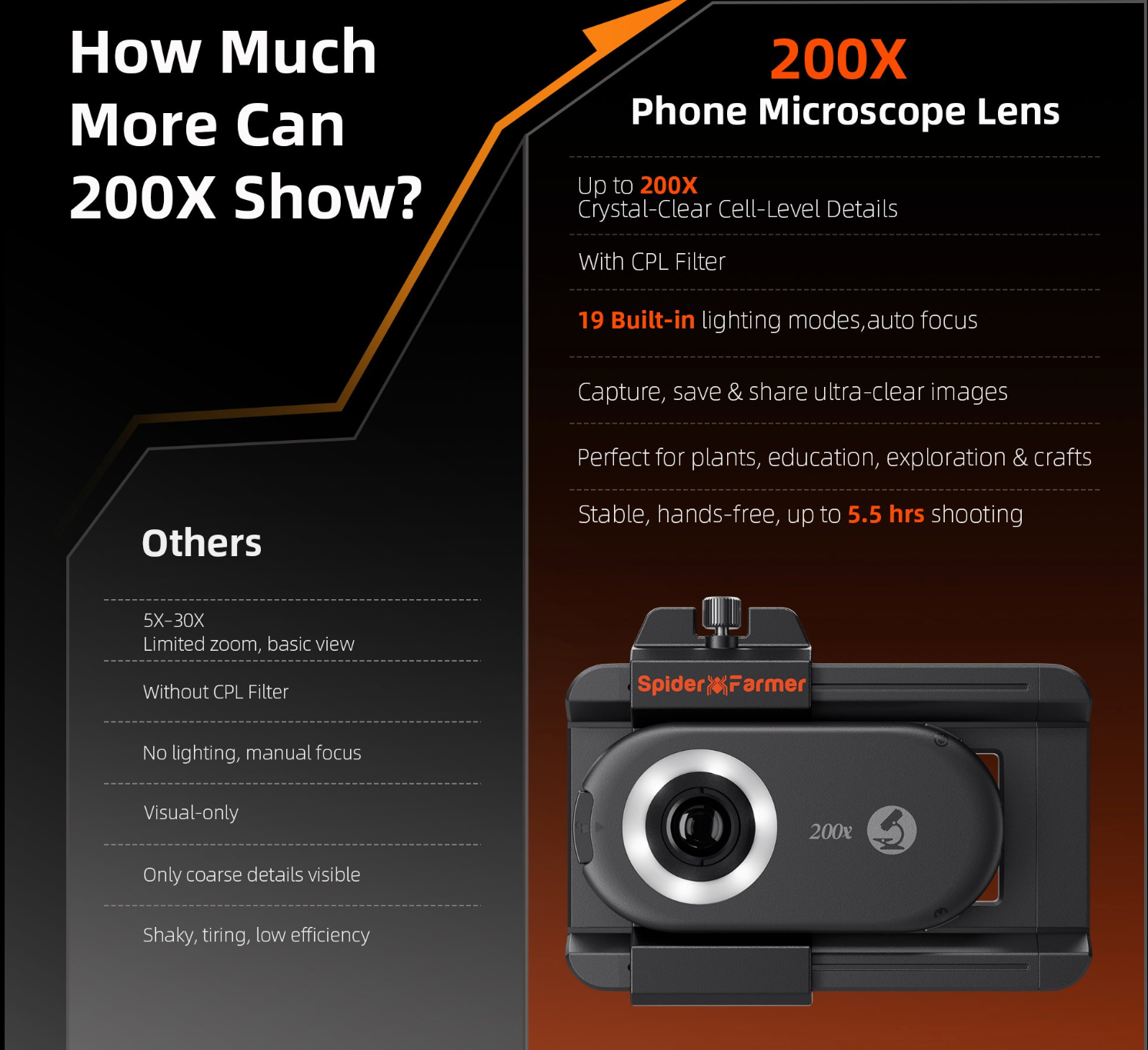 - Spider Farmer Trichome Magnifier: Many growers already have smartphones with advanced cameras. With good lighting and a steady hand, you can easily capture clear, high-quality trichome photos, allowing you to track the plant’s progress and revisit them anytime.