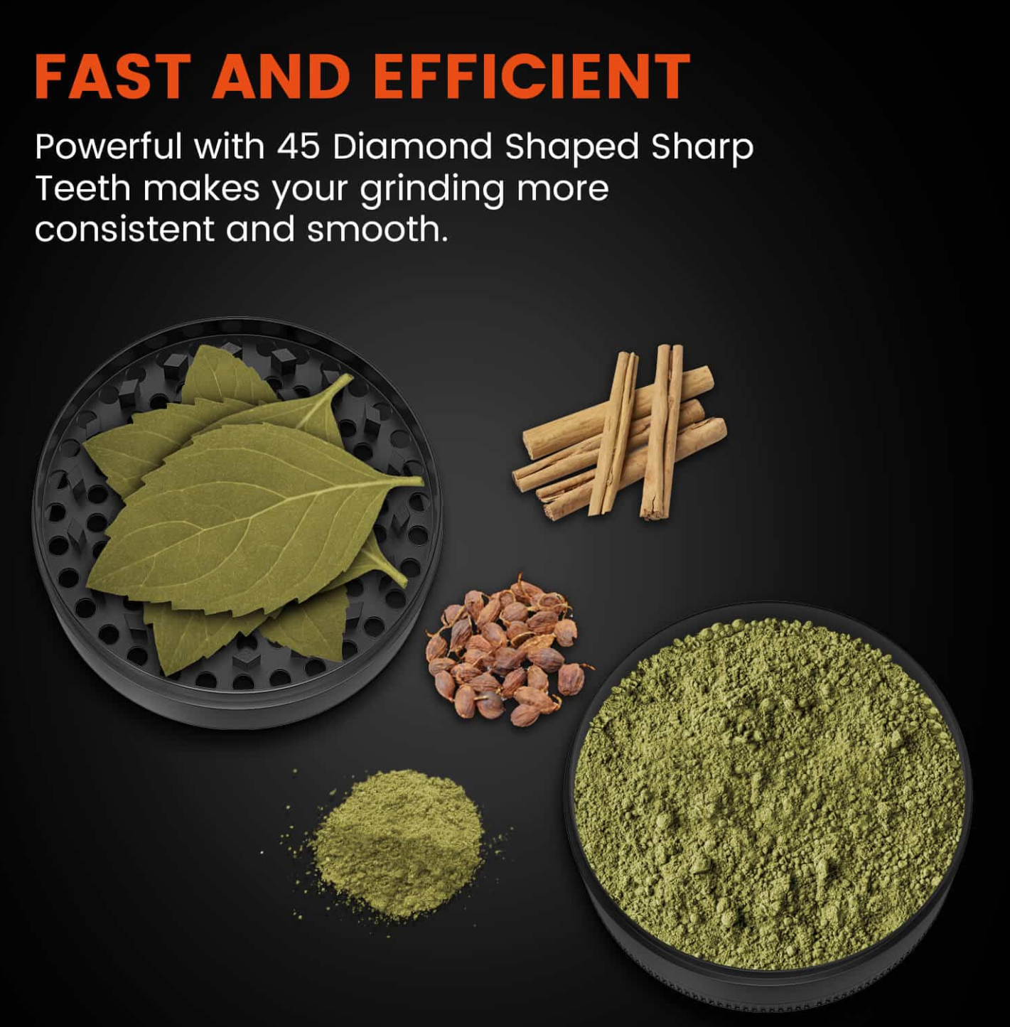 The grinder is equipped with 45 diamond-shaped sharp teeth, ensuring a fast, smooth, and consistent grinding experience. Whether you’re preparing herbs, spices, or flowers, it guarantees uniform results every time for optimal use.